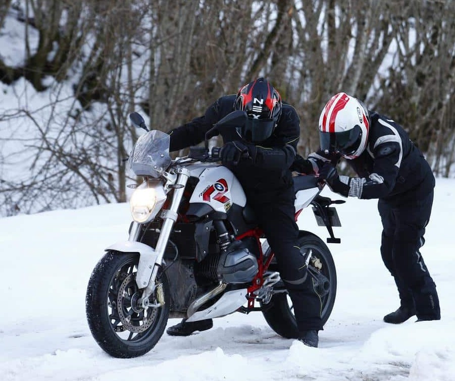 Rouler sur la neige fraîche peut apparaître effrayant. La règle à retenir est d’être délicat. Toutes vos actions sur les commandes doivent être douces que ce soit sur l’embrayage, les freins, l’accélérateur. Évidemment, on évite de rouler trop vite, les mouvements brusques. Plutôt que de se raidir à bord, mieux vaut tenir la moto des cuisses et par les appuis sur les repose-pieds que de tenir trop fermement le guidon. Soulignons que les motos modernes possèdent des assistances : l’ABS va évidemment se déclencher et rallonger les distances de freinage, mais au moins, vous ne perdrez pas l’adhérence (cruciale) de la roue avant. Pour le contrôle de traction, s’il est réglable, peut être faudra t il l’ajuster en conséquence.