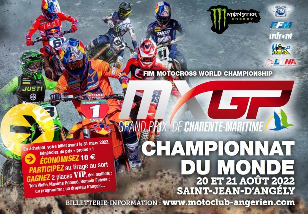 Ce sont les 20 et 21 août prochains que le club de Saint Jean d’Angely accueillera la 18ème des 20 épreuves des championnats du monde de Motocross. A l’occasion de son 90ème anniversaire, le club offre jusque fin mars des conditions préférentielles sur le prix des billets !