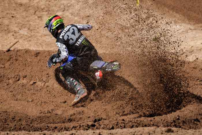 Goupillon saisit l’opportunité de creuser l’écart en MX2. Il réussit l’exploit de s’imposer lors des deux courses de la manche. Il porte ainsi son avance au championnat à 73 points. Lors de la seconde course, il prend le commandement dès le premier tour, réussissant à prendre 30 secondes d’avance sur ses adversaires. Derrière lui, Bogdan Krajewski termine 2ème lors des deux courses. Saad Soulimani termine son premier podium ce week-end en MX2.