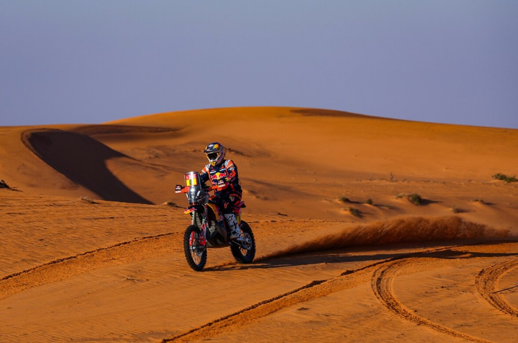 En dépit des nuages qui persistent à stationner au-dessus du périmètre d’évolution du Dakar, on y voit beaucoup plus clair dans la hiérarchie des prétendants au titre après la sixième étape. Le constat est valable dans la catégorie motos, bien que le match soit encore ouvert à une poignée de candidats, au moins parmi les sept premiers qui se tiennent en moins de treize minutes. Luciano Benavides n’en fait pas partie, mais a en revanche mis à profit cette journée pour s’imposer pour la première fois de sa carrière sur le Dakar, pendant que son coéquipier Skyler Howes signe le deuxième temps et conforte sa place au sommet (voir la perf du jour). La concurrence n’est pas pour autant éliminée, puisque les deux anciens vainqueurs Toby Price et Kevin Benavides sont encore de solides rivaux pour le moustachu américain. Nasser Al Attiyah risque quant à lui de manquer d’adversaires pour le faire frissonner dans les jours qui viennent. Alors qu’un match traditionnel mais haletant semblait se profiler avec Stéphane Peterhansel, la configuration de la course a été totalement bouleversée au km 212. « Monsieur Dakar » y a dévissé sur un saut de dunes, et en même temps blessé son copilote Edouard Boulanger, sans gravité si ce n’est la déception de connaître l’abandon.