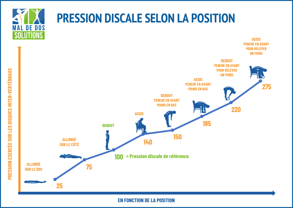 si la pression maintenue sur un disque vertébral en position debout est de 100, elle passe à 140 lorsque vous êtes assis avec votre tête alignée sur votre buste. Si vous êtes assis sur votre siège et que vous penchez votre tête vers l’avant, vous faites encore augmenter la pression sur les disques intervertébraux, qui sont les amortisseurs de votre colonne vertébrale. Cette pression, qui peut aller de 150 à 185, peut être supportable à court terme mais peut devenir pénible et source de douleurs à long terme.
