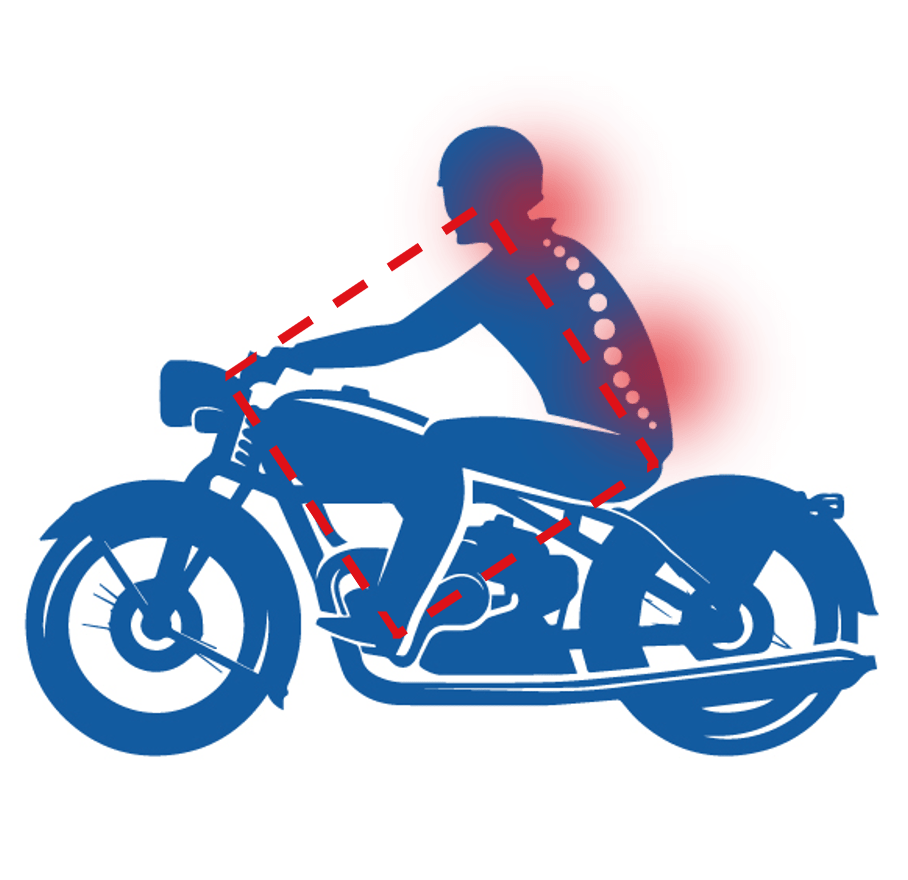 en moto, votre colonne vertébrale est soumise à des compressions discales, des vibrations et des chocs inhabituels, et toutes les positions adoptées peuvent avoir un impact sur votre colonne vertébrale. Des douleurs et des traumatismes peuvent survenir lorsque la colonne n’est pas dans une position adéquate.