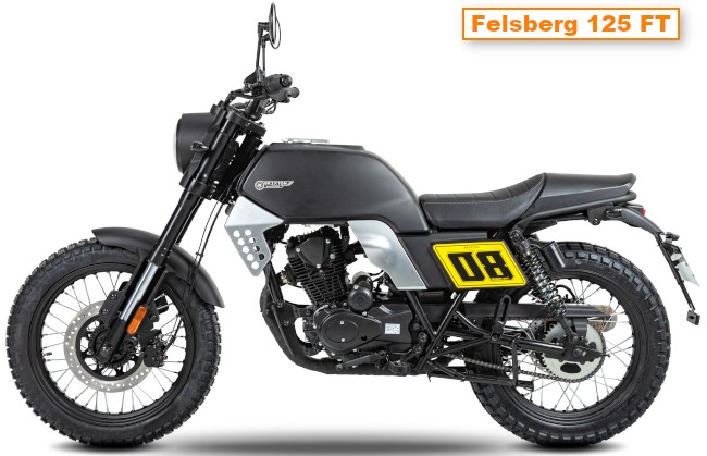 La « deux-et-demi » servira justement de base pour créer une nouvelle déclinaison proposée dans les deux petites cylindrées : les Felsberg 125 ou 250 FT inspirées du Flat Track, avec l’incontournable plaque de numéro, « une selle passager accessible via une coque arrière amovible (…), des pads en caoutchouc amovibles sur le réservoir ».