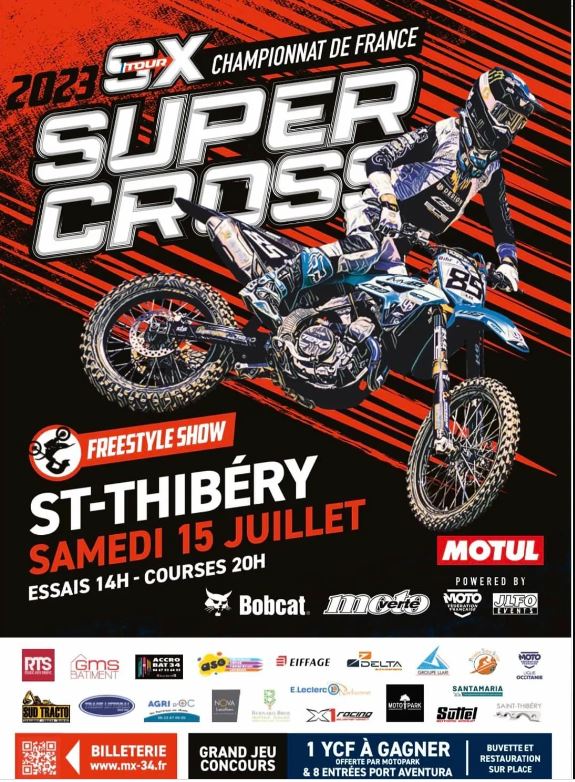 La seconde manche du Championnat de France de Supercross 2023 se tiendra dans la nouvelle Arena Supercross de Saint Thibery le samedi 15 juillet 2023.