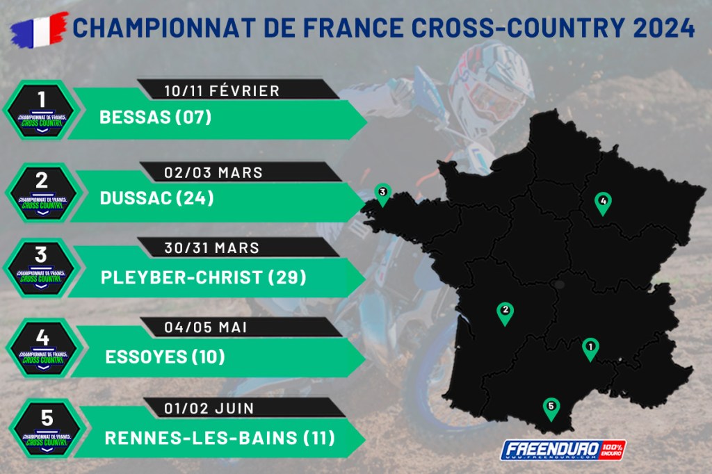 C’est en Ardèche début février du côté de Bessas (07) que se déroulera l’ouverture du championnat 2024. Un mois plus tard se sera direction la Dordogne à Dussac que les pilotes se rendront. Toujours en mars, la 3ᵉ épreuve se tiendra à Pleyber-Christ en Bretagne avant un petit break d’un mois pour retrouver l’avant-dernière manche à Essoyes dans l’Aube. Enfin, la finale du championnat de France de Cross-country 2024 se déroulera elle dans l’Aude à Rennes-les-Bains le premier weekend de juin.