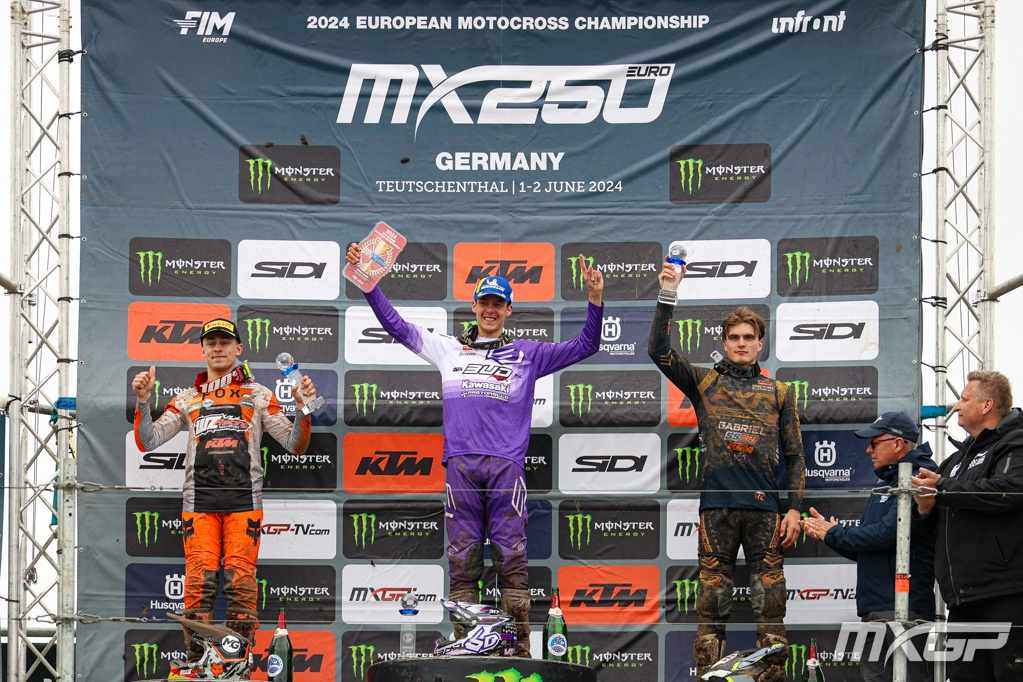 Dans la foulée du GP de France qu’il avait remporté, Mathis Valin (Kawasaki), pilote de l’Équipe de France Espoir 250cc, s’est imposé à nouveau ce week-end lors du GP d’Allemagne devant son compatriote Maxime Grau (KTM), également pilote de l’Équipe de France Espoir 250cc, et le Néerlandais Cas Valk pour un doublé tricolore ! Mathis a fait P5 en première manche, avant de l’emporter dans la seconde. P2 en première manche, Maxime a fait P4 de la suivante.