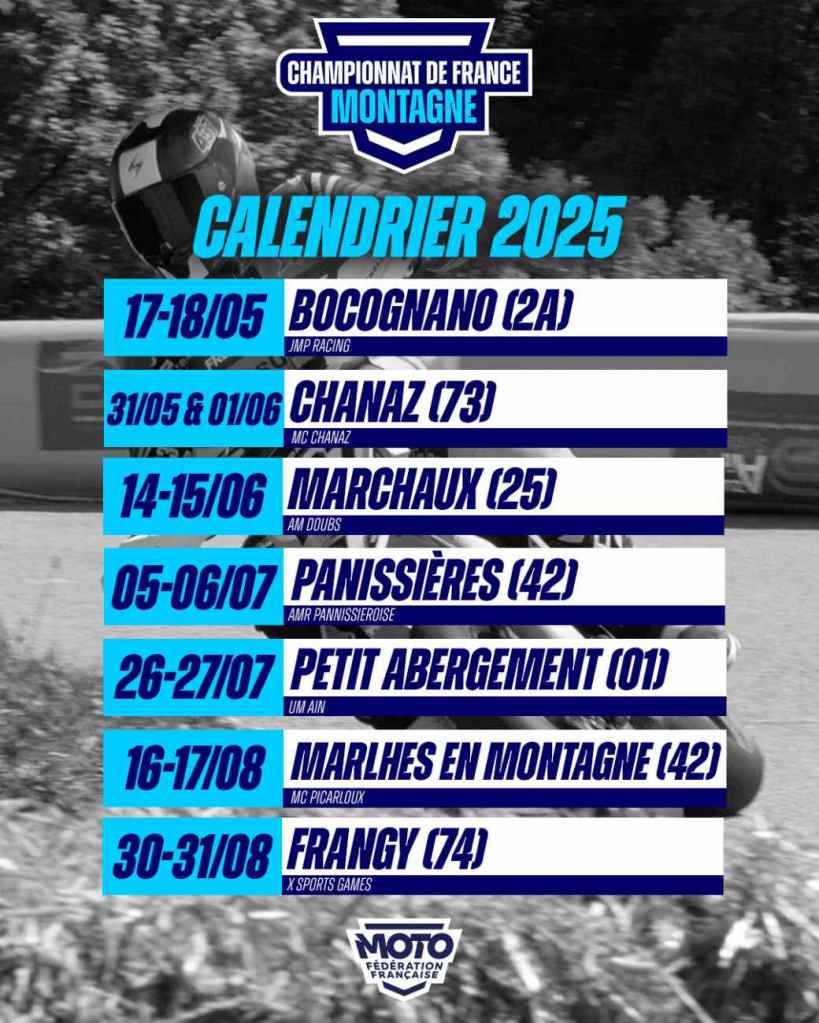 | Éducative (hors classement, non chronométrée) – Âge : dès 6 ans – Numéros : E01 à E99- Moto : jusqu’à 50 cm³ à variateur (8 ch max) | Superbike Montagne – Âge : dès 16 ans – Numéros : 401 à 499- Moto : – 601 à 1400 cm³ (4 cyl.) – 766 à 1400 cm³ (3 cyl.) – 956 à 1400 cm³ (2 cyl.) |