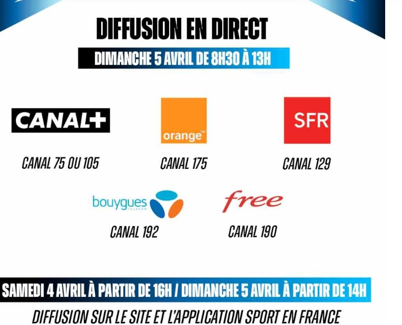 En complément, la chaîne du mouvement sportif français Sport en France diffusera en live les courses du dimanche 5 avril de 8h30 à 13h00.