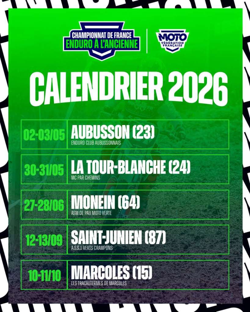 Calendrier 2026 – Championnat de France d’enduro à l’ancienne + Trophée féminin d’enduro 02 & 03/05/2026 – Aubusson (23) – Enduro club Aubussonnais