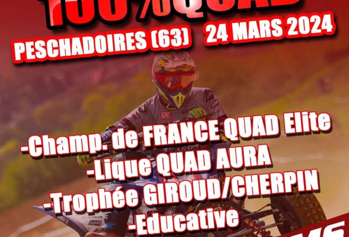 Le Peschadoires Moto Sport reçoit la manche d’ouverture du CF Quad Cross Élite 2024 sur la piste de Motocross de Chaudier au Sud de Peschadoires près de Thiers. Un événement 100 % … Continuer la lecture de Championnat Quad Cross Elite ce week-end