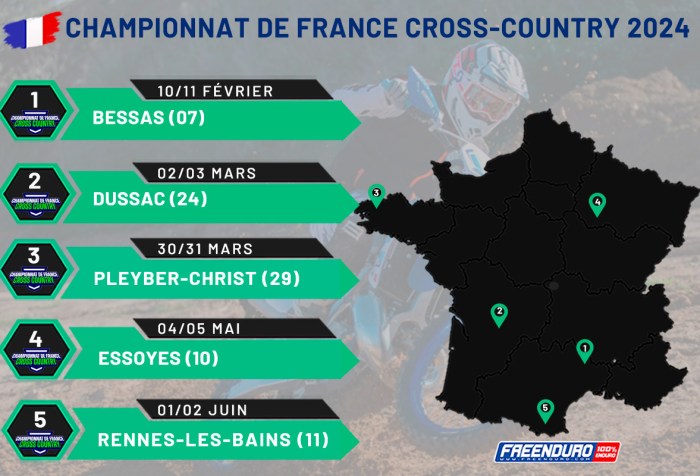 Voici le calendrier provisoire du champion de France de cross-country moto 2024. Comme les années précédentes, le championnat se jouera sur 5 épreuves reparties sur la première moitié d’année. C’est en Ardèche début … Continuer la lecture de Championnat de France Cross Country