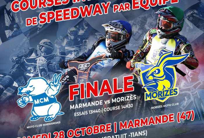 Le Moto-Club Marmandais organise le samedi 28 octobre la Grande Finale de la LNS Motul 2023 entre Marmande et le Morizès Moto-Club ! Le samedi 28 octobre prochain, le Moto-Club Marmandais accueillera la Finale de la Ligue Nationale Speedway … Continuer la lecture de Speedway ce week-end à Marmande
